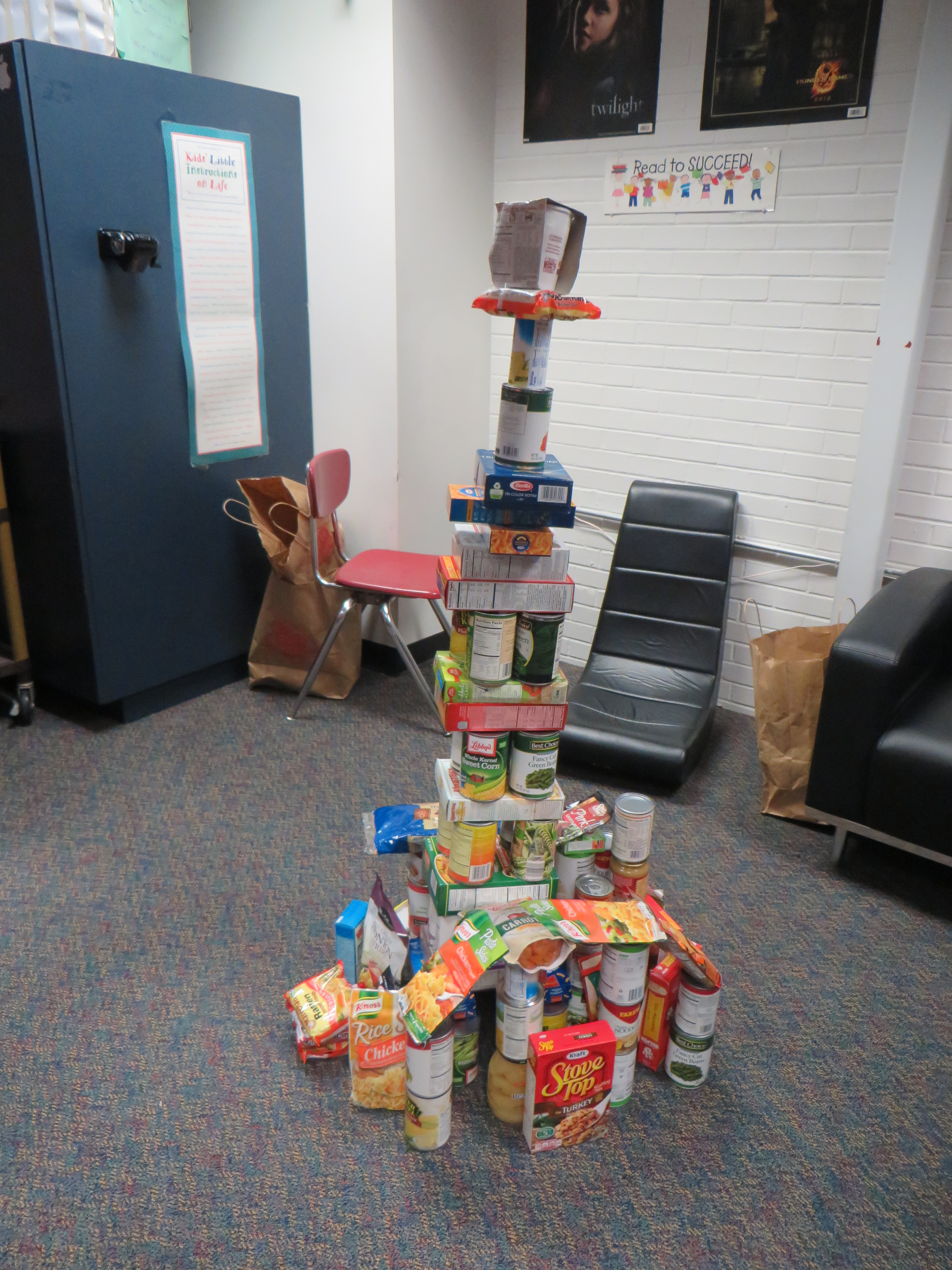 For the last day of my student teaching placement, students in Dugout (the group of sixth, seventh, & eighth graders that hang together on Fridays at 10:30) participated in a canned food drive where they made sculptures out of their items!