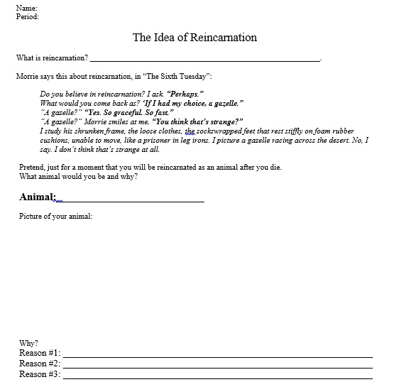 I created a worksheet that incorporated one of Morrie’s statements about reincarnation. When I read that section aloud last week, we talked about what reincarnation was, and also about Morrie wanting to be reincarnated as a gazelle.